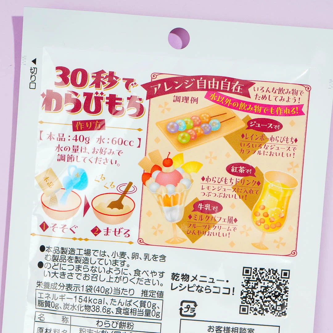 وارابيموتشي هو نوع من الواغاشي (حلوى يابانية تقليدية) مصنوع من نشا السرخس المغطى بمسحوق فول الصويا المحمص. الآن يمكنك تحضير وارابيموتشي بنفسك باستخدام هذه المجموعة. كل ما عليك فعله هو خلط مسحوق وارابيموتشي بالماء أو العصير أو الشاي الساخن. يمكنك تناوله بمفرده أو إضافته إلى الحلويات الأخرى مثل الآيس كريم!